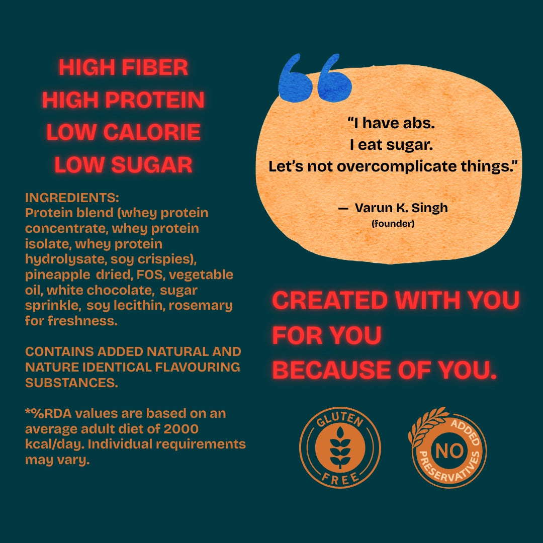 Protein blend (whey protein concentrate, whey protein isolate, whey protein hydrolysate, soy crispies), pineapple dried, FOS, vegetable oil, white chocolate, sugar sprinkle, soy lecithin, rosemary for freshness.